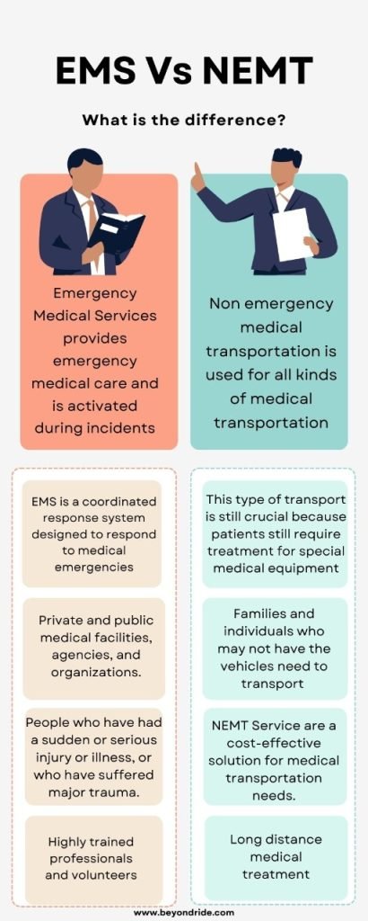 EMS and NEMT: What is The Difference? However, some people don't know the difference between the two main ones: Emergency Medical Services (EMS) and Non-Emergency Medical Transportation (NEMT) services. How...